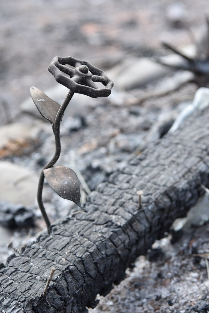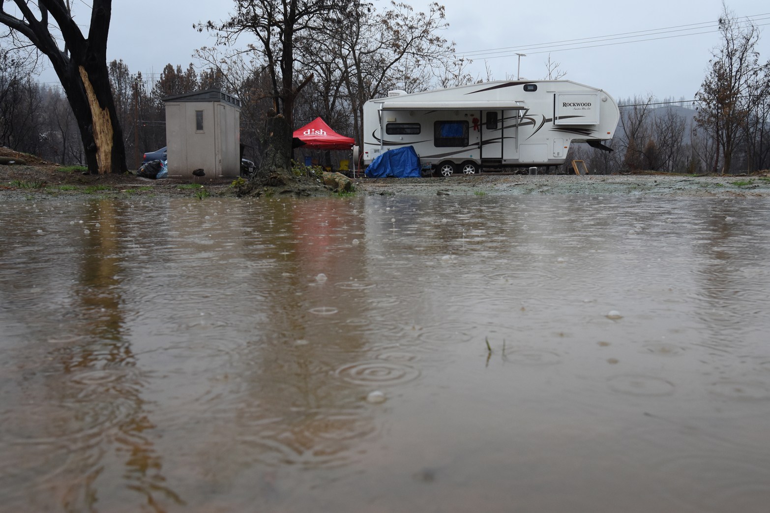 The rain is a more-than-welcome respite from the dry, windy heat of that terrible summer. After Doug and Jeanette evacuated, they stayed in an evacuation shelter at the local community college until they were able to get back to their property. There was nothing for them there when they returned. They improvised a shelter, wrapping tarps around a pop-up canopy, and lived out of that.
